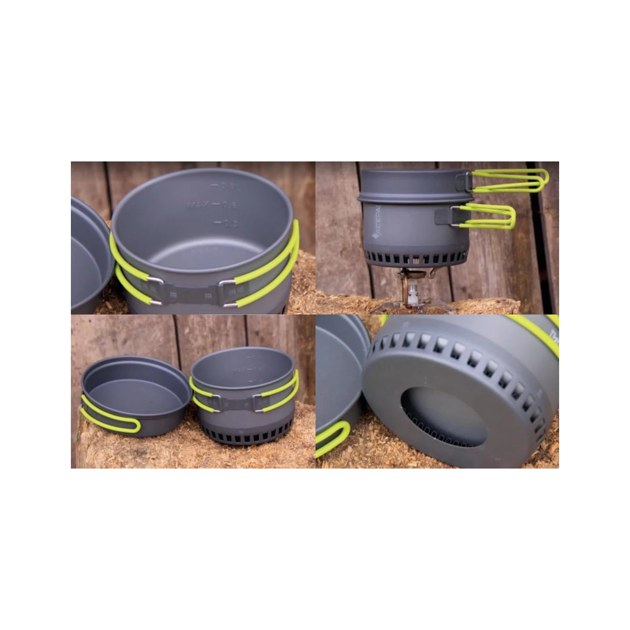 Price only for pot and pan. Everything else shown on pictures like cooking equpement and bag are not included and are just to show the use. Set comes with red handles.