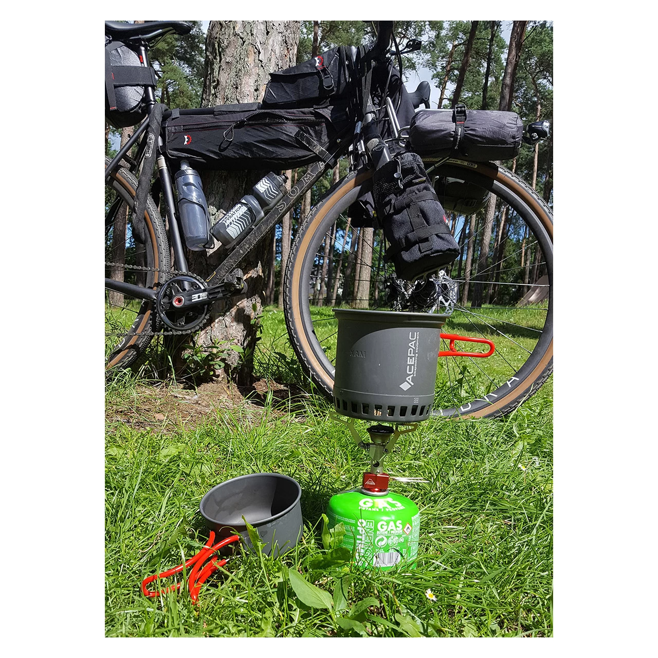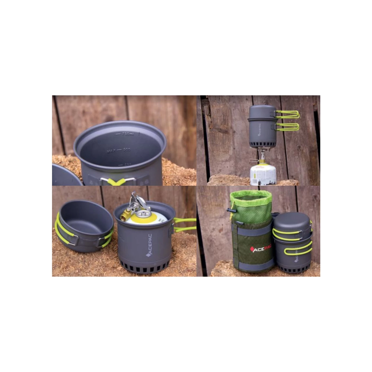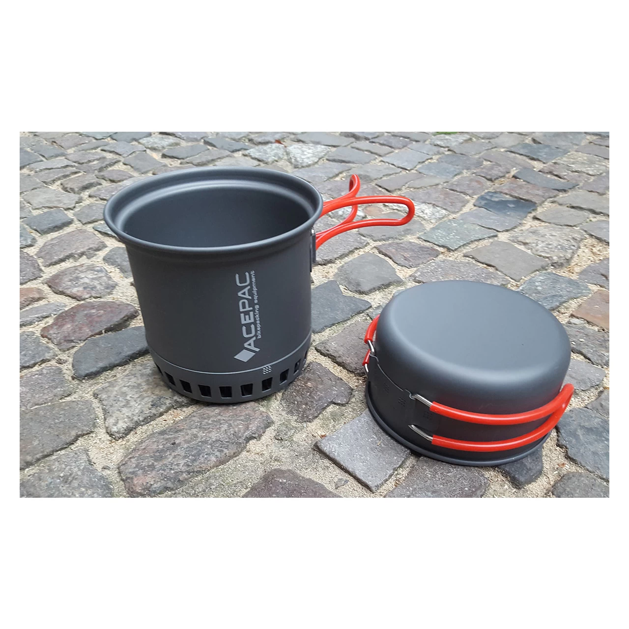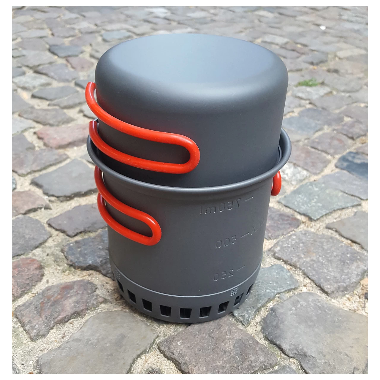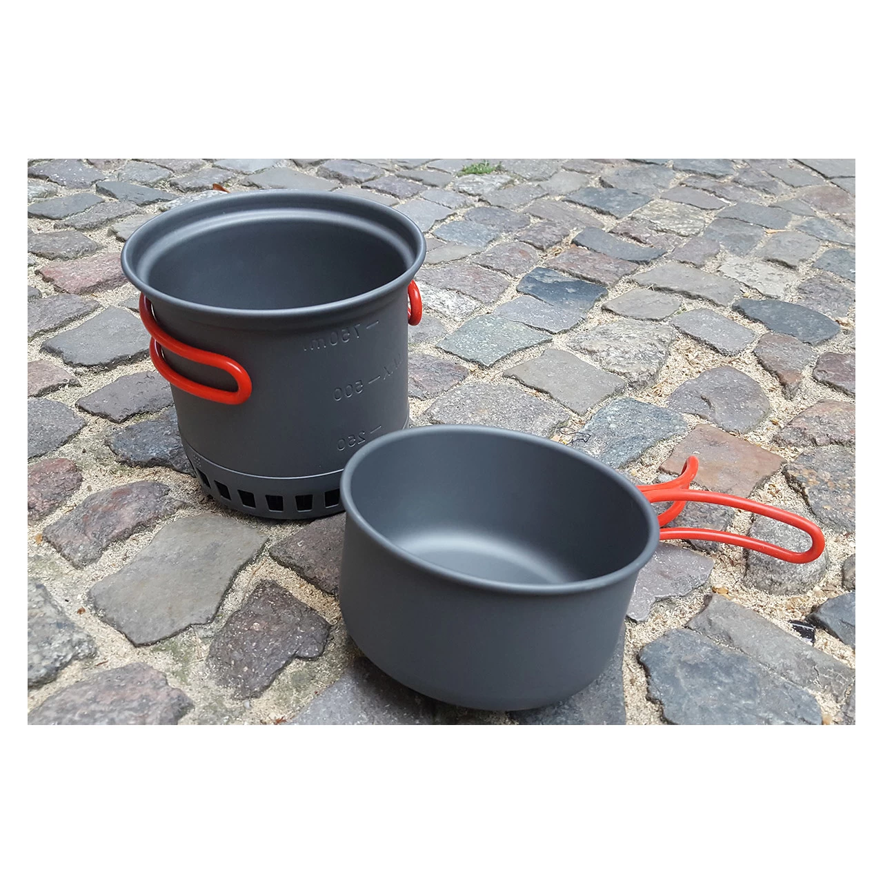 Price only for pot and pan. Everything else shown on pictures like cooking equpement and bag are not included and are just to show the use. Set comes with red handles.