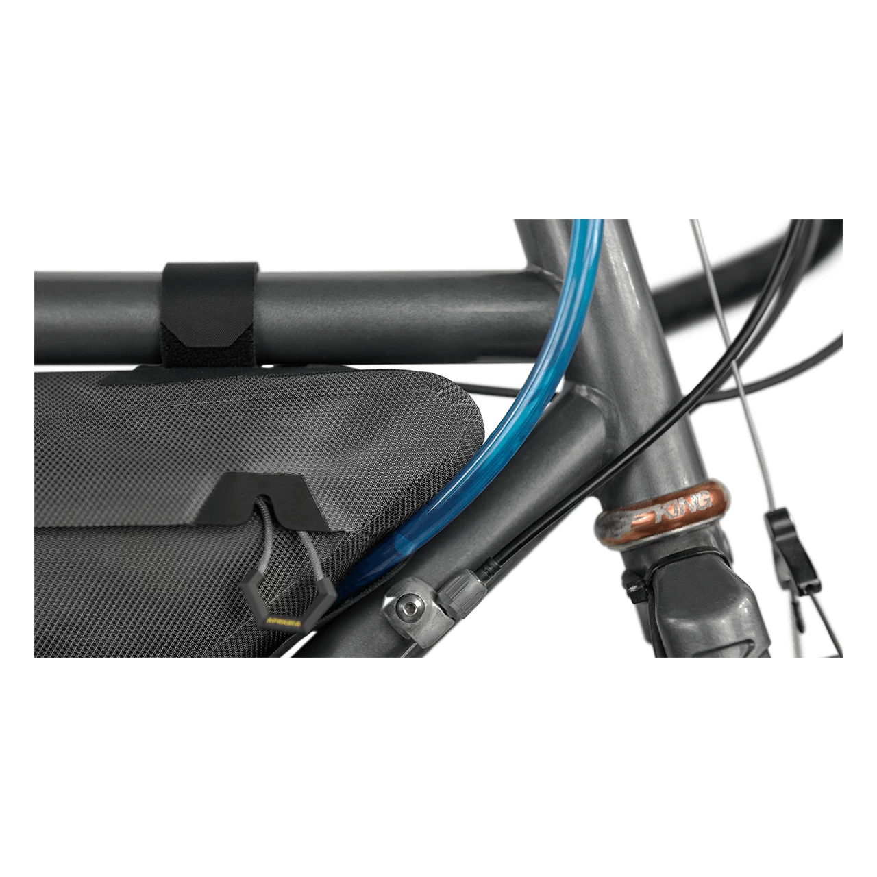 - Battery lead / hydration hose port underneath along the down tube.