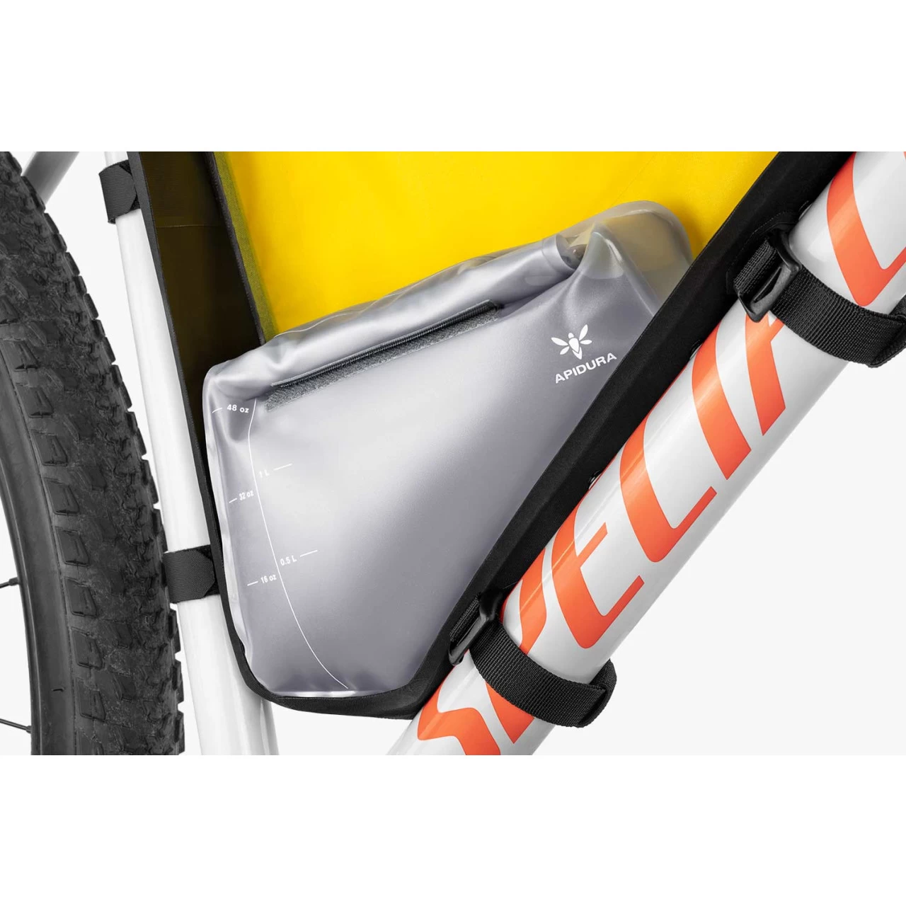 The Frame Pack Hydration Bladder is a convenient solution for carrying water when you don’t have space for bottle cages in your bike’s main triangle. Available in 1.5L and 3.0L capacities, the shaped hydration bladder is easy to fill without needing to be removed from your frame pack and connects to the accessory clip in Backcountry Frame Packs for improved stability. As the first bikepacking-specific frame bag hydration bladder, it makes efficient use of space, so you don’t need to compromise between carrying water and other essentials. The hydration bladder is compatible with all Apidura Full Frame Packs and packs of a similar size, with a 1.2m long detachable hose designed to route through the hydration port to your cockpit for easy use while riding..