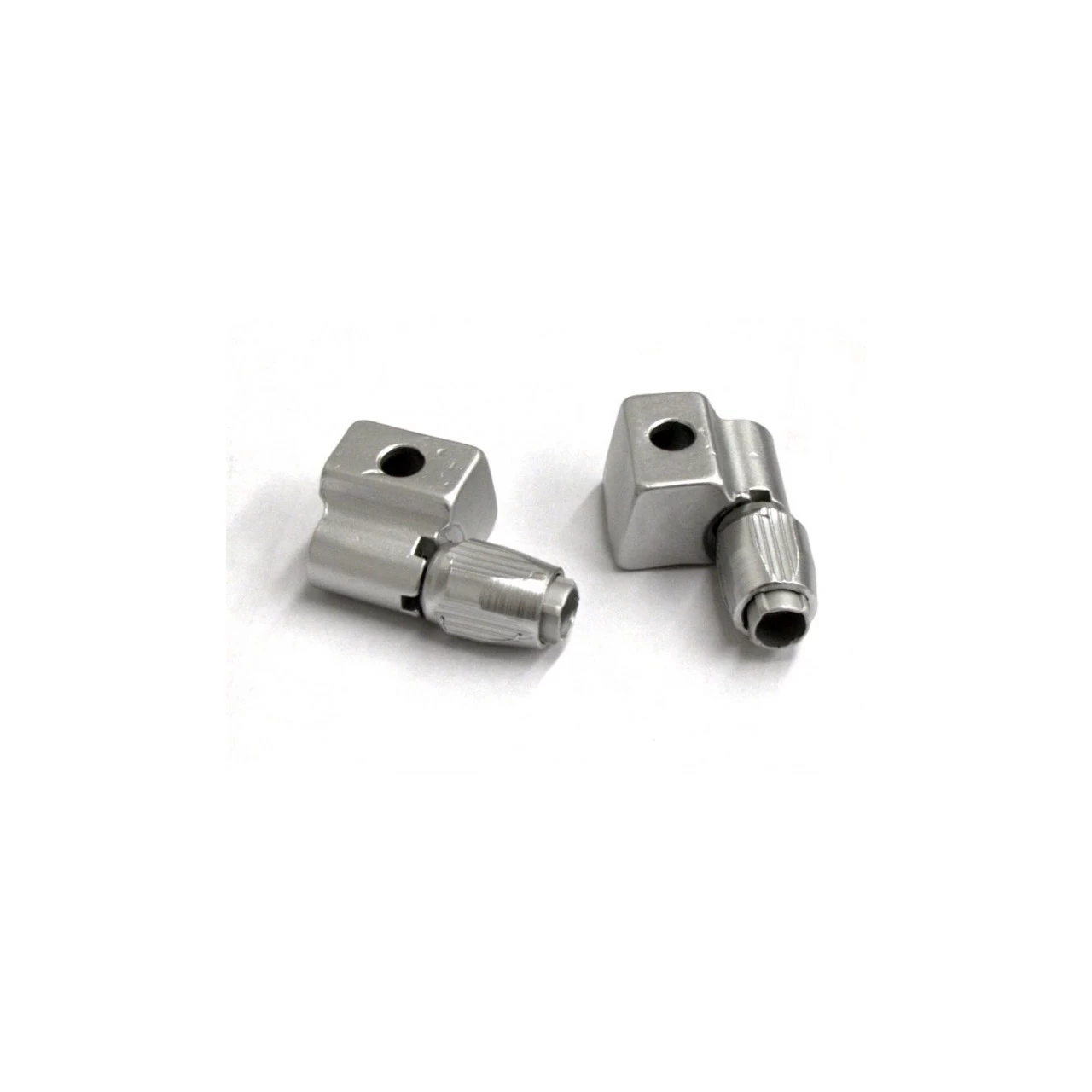 These inexpensive alloy downtube cable stops have curved backs and fit standard shifter bosses. The adjusters have indents, so they won’t loosen accidentally. The finish is silver anodized and usually a little rough looking with some minor pitting.