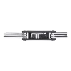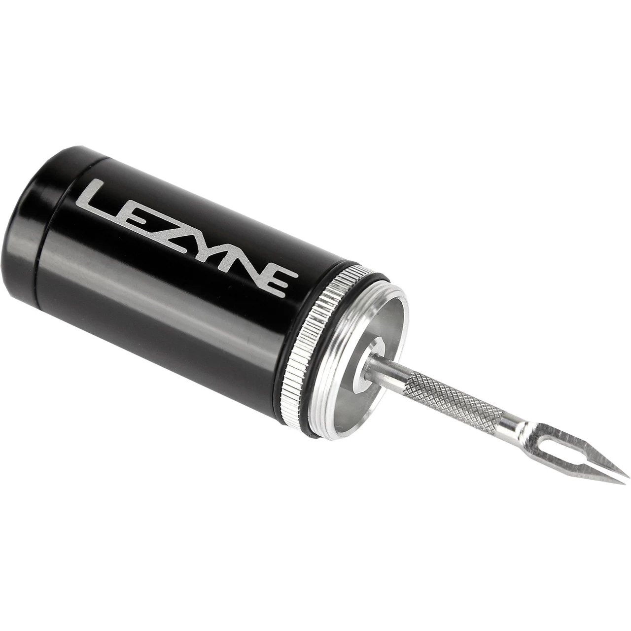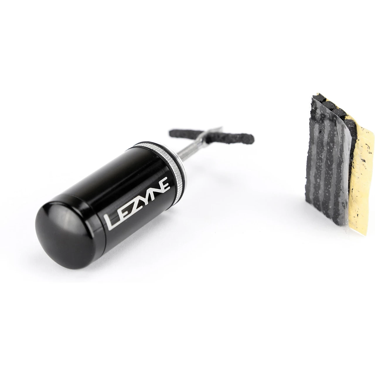 Compact tubeless tire repair kit with machined aluminum storage tube that doubles as a handle. Combined tire reamer and insertion tool. Includes five tire plugs.