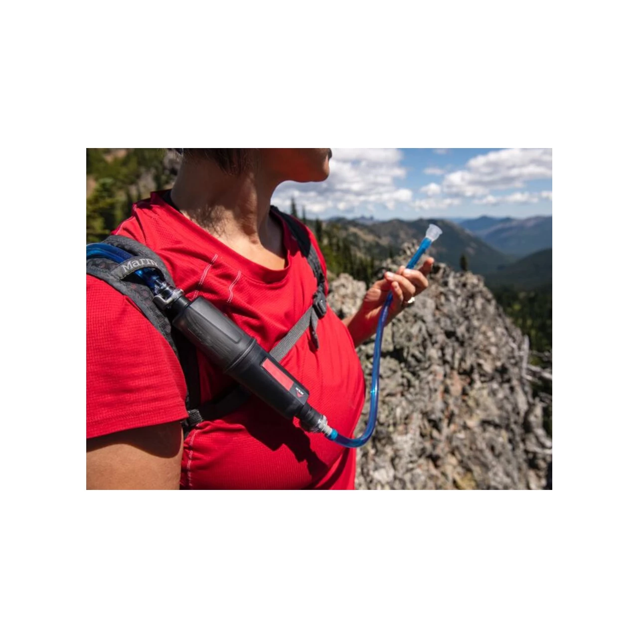 Thanks to its very light weight, the Thru-Link in-line filter is the easiest solution for filtering water on the go. The filter can be easily connected to any hydration bladder and always has fresh drinking water available. It is designed for high volumes and ensures that the drinking water supply is maintained even on long day hikes and high-speed excursions is no problem. The filter is compatible with all drinking systems. Filtering is done by hollow fiber technology and activated carbon for tasteless water. When camping, the Thru-Link can also be used as a gravity system for pumpless filtration.