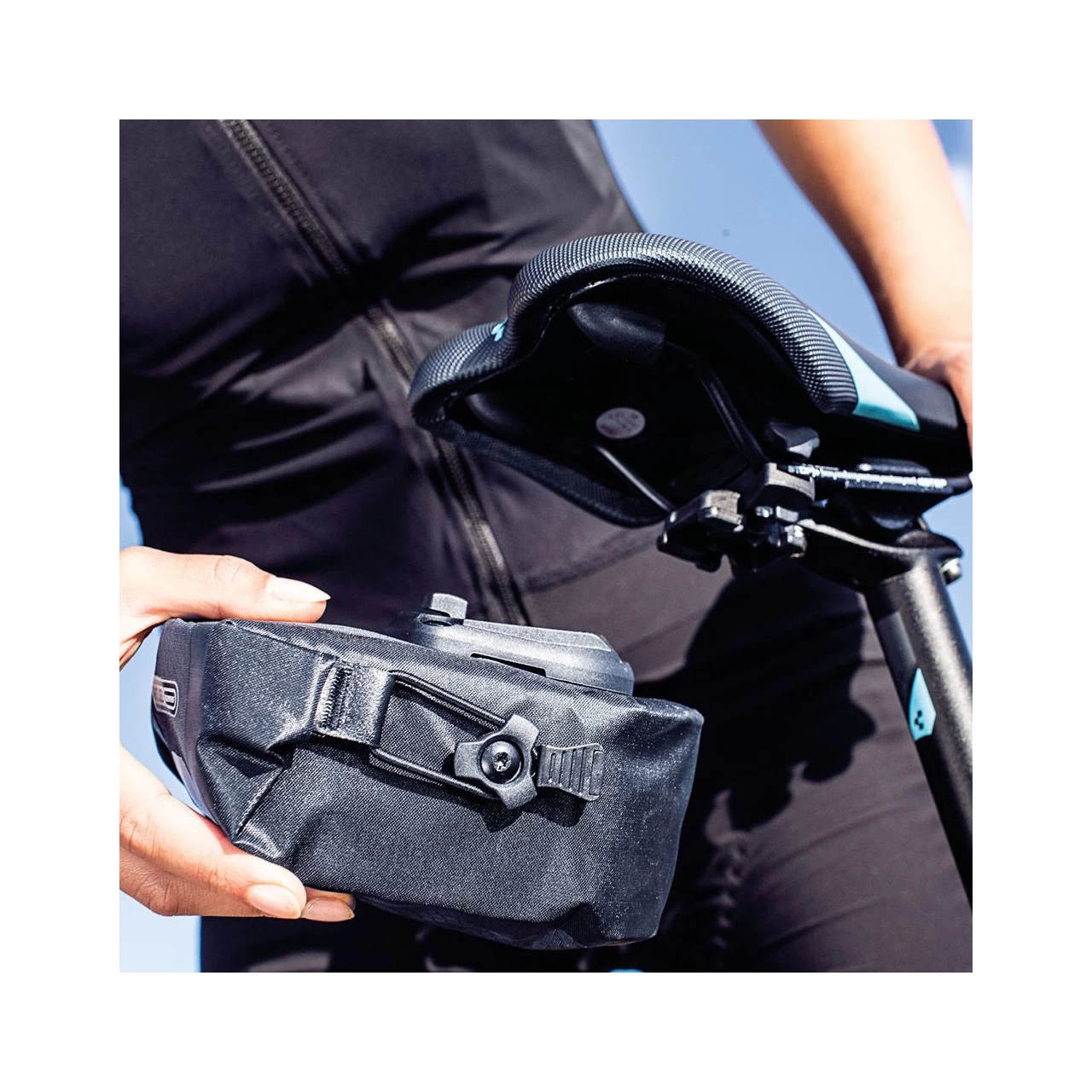 Minimalism to the max is a good description of the ultra-lightweight seat pack for road bikes and mountain bikes. The Micro Two was specially designed for those demanding tours when every gram counts. In addition to being 100% waterproof, the pack offers you space enough for a few critical items such a replacement tube, a bike kit or first aid materials. Its roll closure and elastic drawstrings allow you to collapse its size down to a minimum. And thanks to its extremely small dimensions, it can be mounted to your bike in an extremely space-saving manner. Simply attach the mounting bracket to your seat stays. Then attach or detach the pack with a single hand using the snap buckle. While the snap-on system was again enhanced for user friendliness, the Micro Two remains compatible all predecessor models.