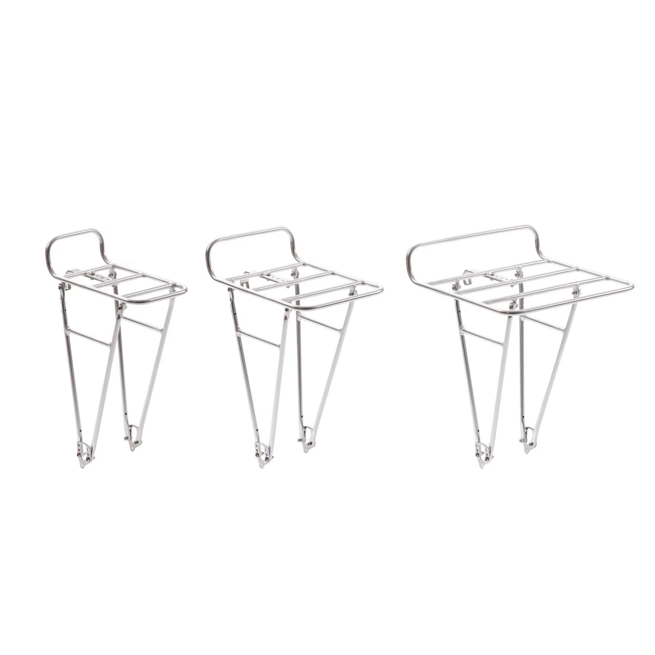 A new, lighter aluminium version of our do-it-all front rack. The same classic design now comes in three different sizes from a small handlebar bag carrier to a full size rack. Perfect for your everyday stuff, weekend camping gear or a late night pizza. The versatile attachment options make the rack easy to install and it fits most bicycles with 26” or 28” wheels. The Commuter Aluminum rack comes with mounting piece for a front light..