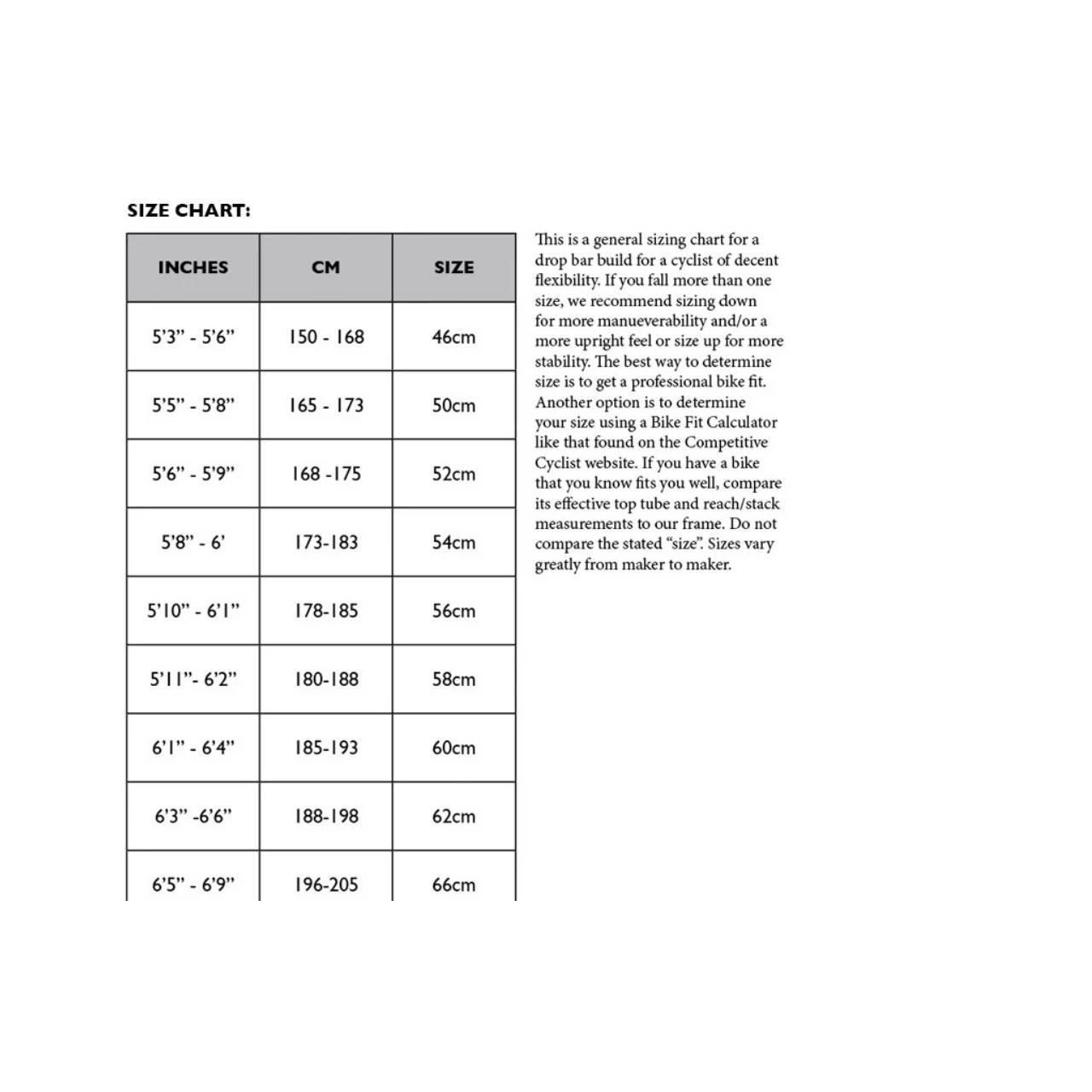 - Sizes: 46, 50, 52, 54, 56, 58. 60, 62 and 66cm (We recommend 650b tires on the 46cm)