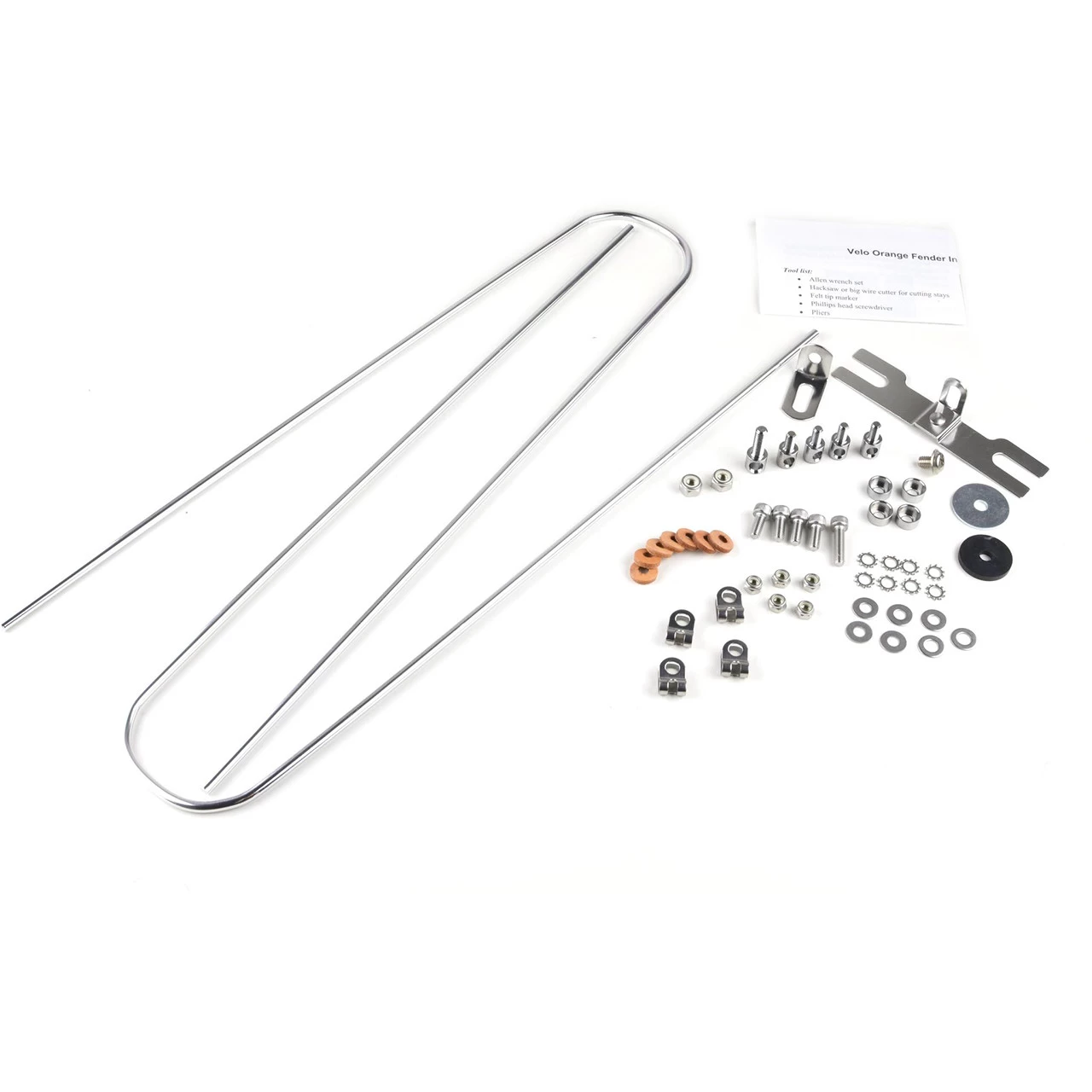 - Hardware kit includes: 5mm polished aluminum stays, R-clips and screws, L bracket, reinforcement plates, stay-to-fender closed eyelet bolts, fork crown daruma, sliding bracket, leather washers, and detailed installation instructions