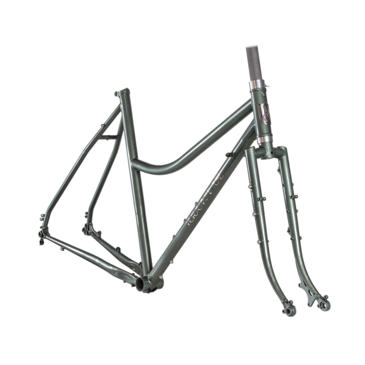 There are star reinforcements on nearly every braze-on on the frame and fork. The rear brake routing is internal and features super easy installation via a brazed in tube – no more fishing for the housing. The paint is a brilliant Metallic Sage.