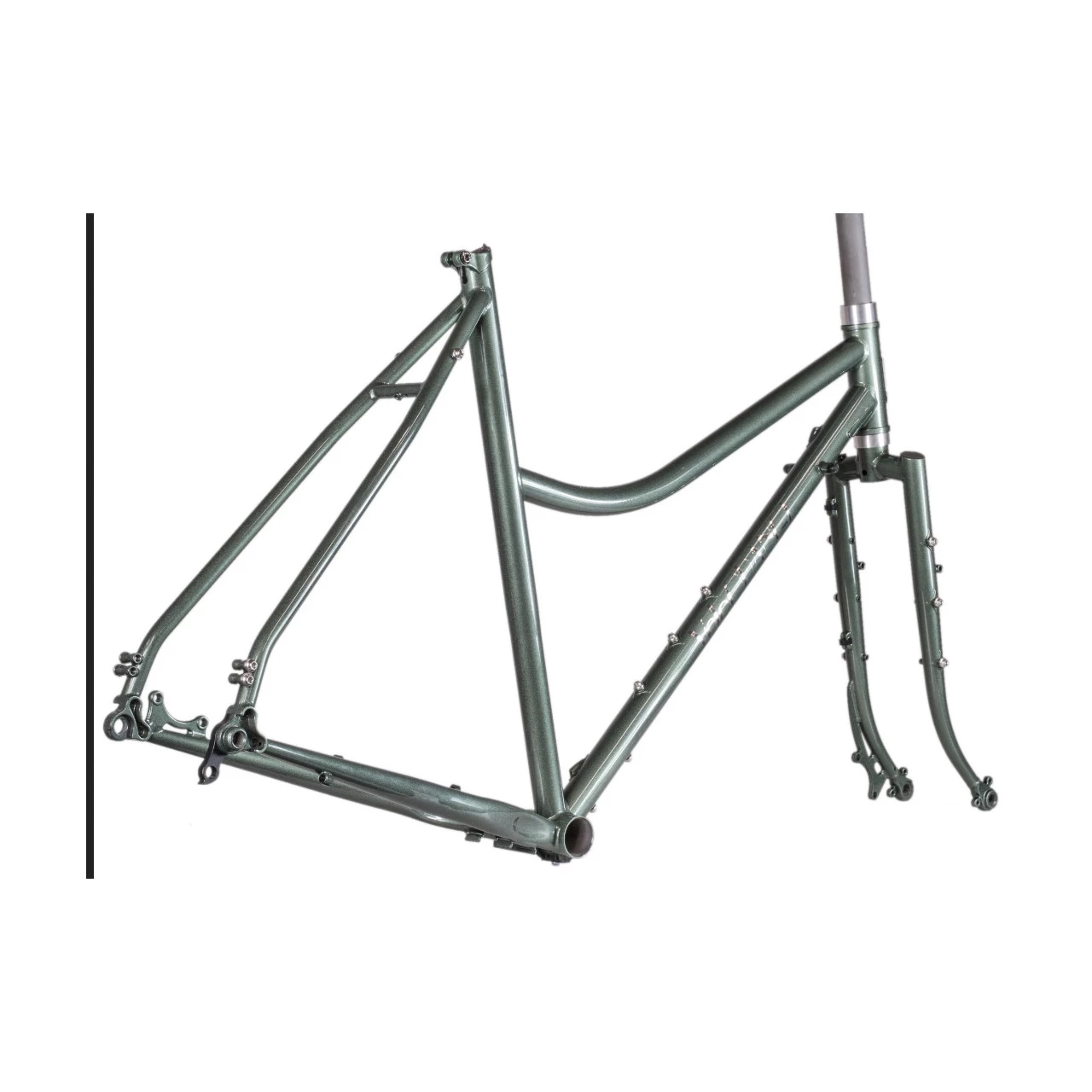 - Fork Eyelets: Double eyelets on fork dropouts for racks and fenders. Triple thru-bosses on the blades for lowrider racks. Hourglass braze-on for Randonneur or Campeur Racks.