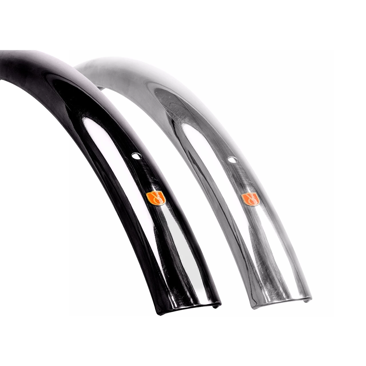 These fenders feature a beautifully simple Smooth pattern available in high polished silver and smooth Noir. They’re 38mm wide, designed for 700c wheels, and work with tires up to 30mm wide. We include a hardware kit to work with almost any type of mounting in the same finish as the fenders.