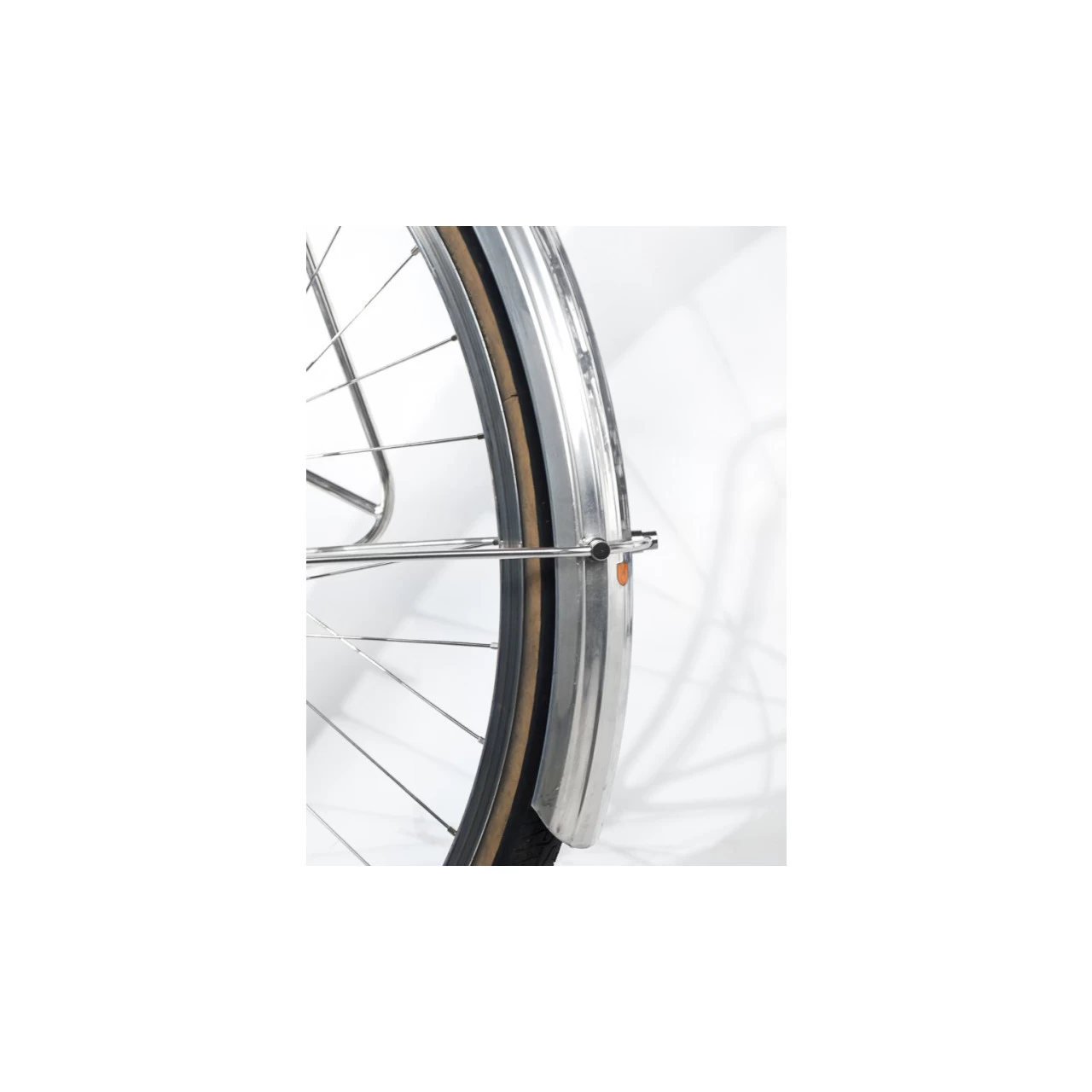 These are a version of the classic zeppelin profile aluminum fenders. They have an elegant art-deco profile that’s lovely on classic or modern frames. The 650b size fits 650b wheels perfectly, and is pretty good fit on 26″ wheels too. The hardware includes: 5mm polished aluminum stays, R-clips and screws, stay-to-fender closed eyelet bolts, fork crown daruma, sliding bracket, and leather washers. This is the new version, with holes for 2 eyelet bolts for increased stability The front fenders are 90cm long and the rear are 120cm. They are pre-drilled. For tires up to 42mm wide. Sold as pairs only.