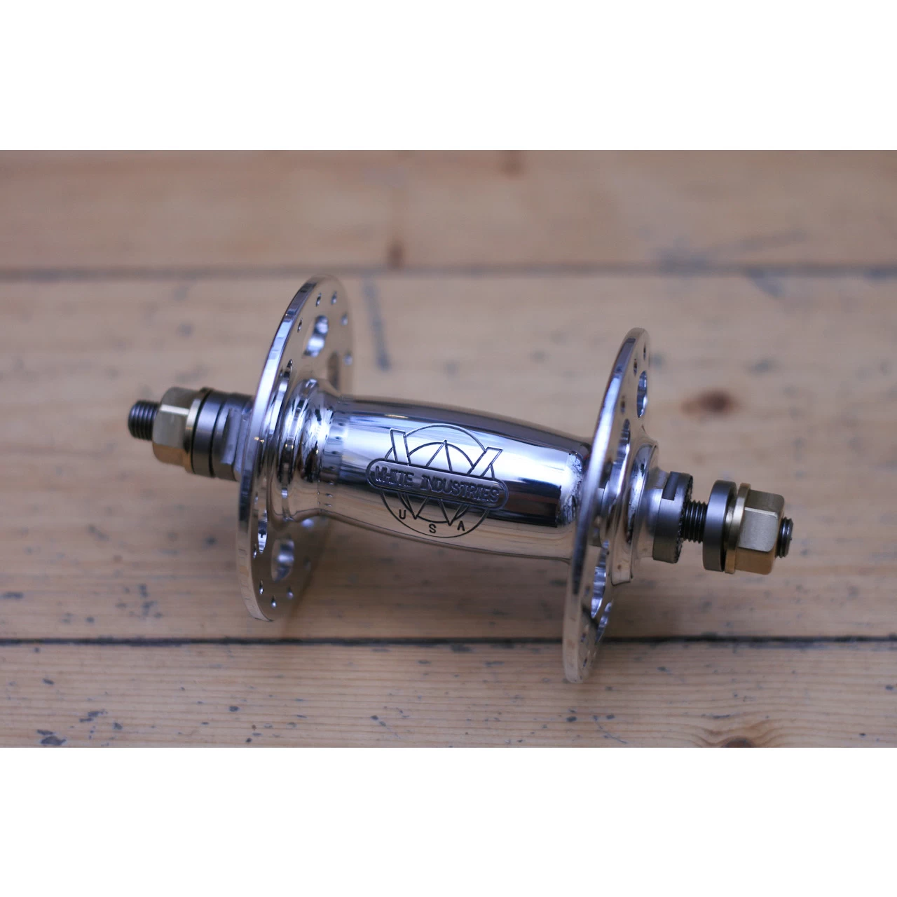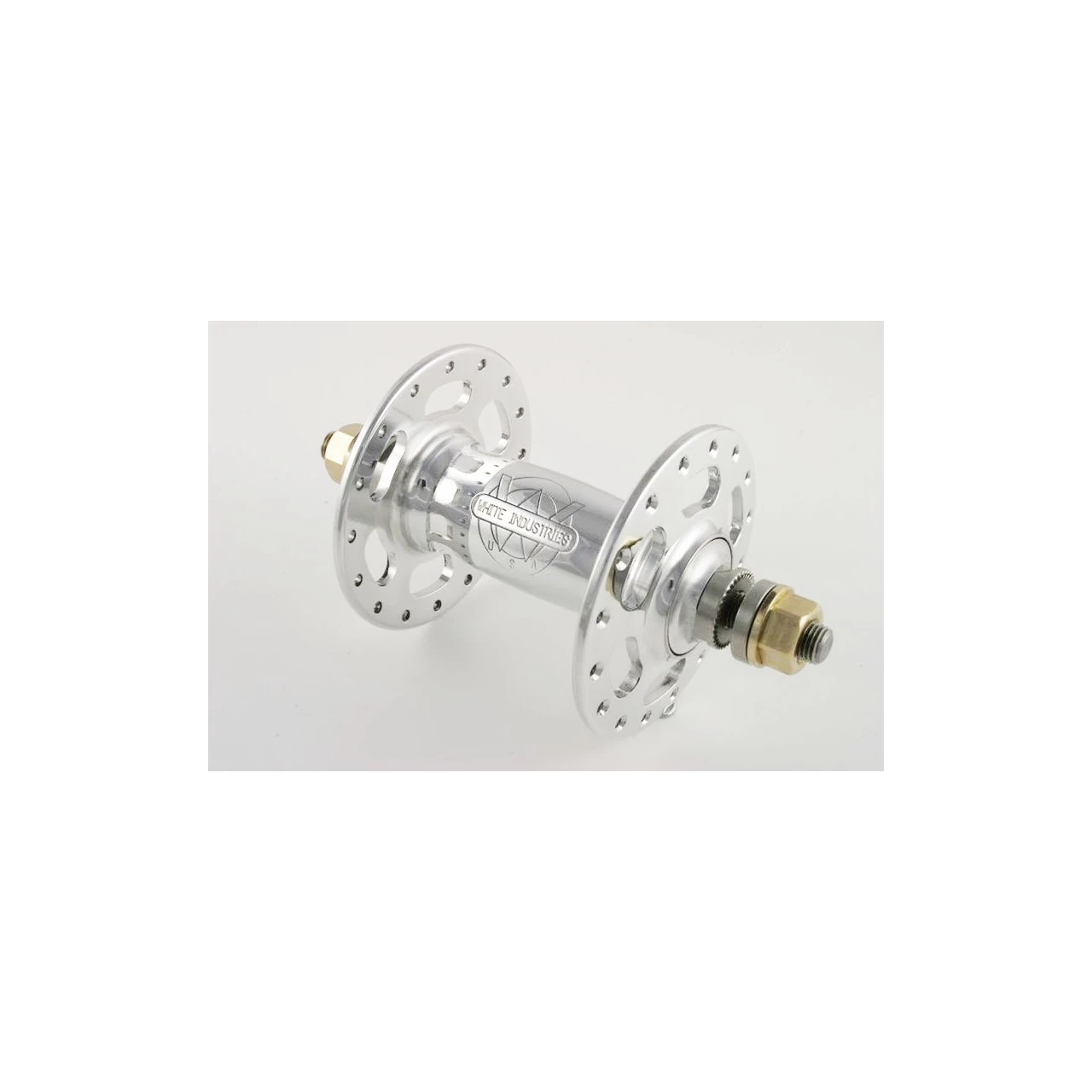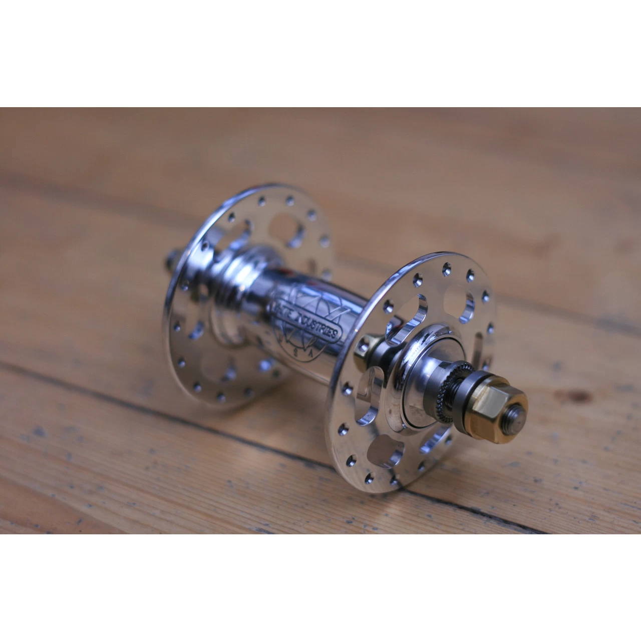 For the purist our track hubset is designed in the traditional vintage style with high flanges and window cut outs. Solid threaded axles are graced with bronze axle nuts to set off the beauty of this hubset. The rear hub is spaced to 120mm, track specific spacing, and the fixed gear interface is our spline design which eliminates the issue of stripped cogs. Â